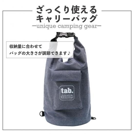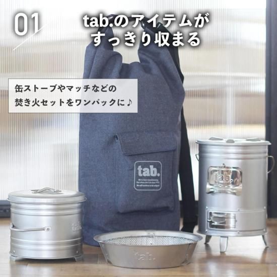 缶ストーブやマッチなど焚き火セットをワンパックに。アイテムを取り出した後は、燃料のギャザリングバッグにも使えます。丈夫なデニム生地で長い枝や薪も気にせず詰め込めます。