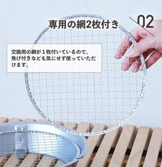 ・焼き網は簡単に取り外して交換可能(替え網1枚付き)。