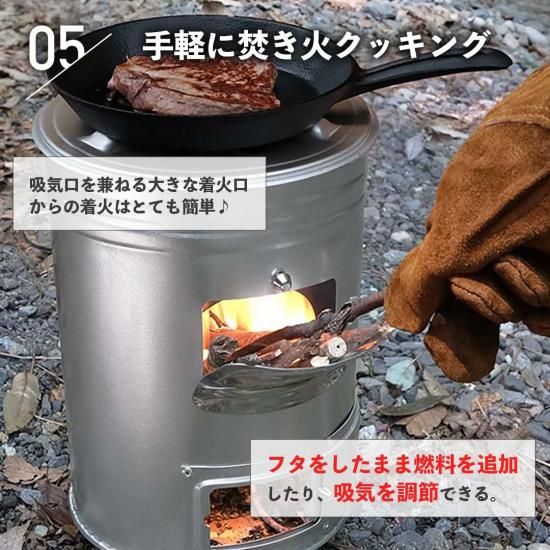独自のフィックスストリーム機構で気流を整え、理想的な燃焼を実現。二次燃焼で煙や燃え残りも少なく、焚き火台としても使えます!