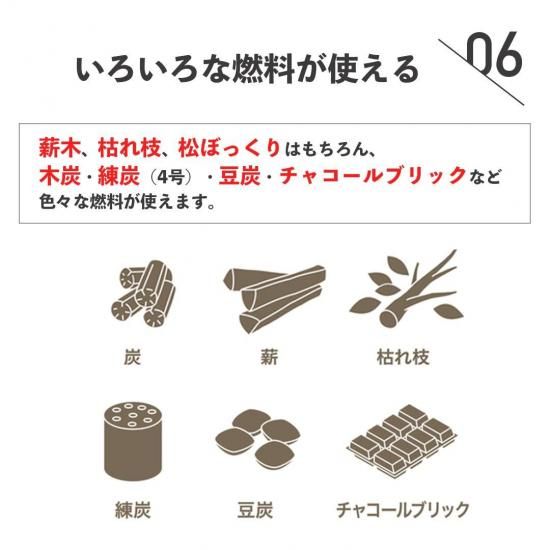 木炭、練炭、薪や枯れ枝などいろいろな燃料が使えて簡単着火!好きな場所で手軽に焚き火クッキングができます。